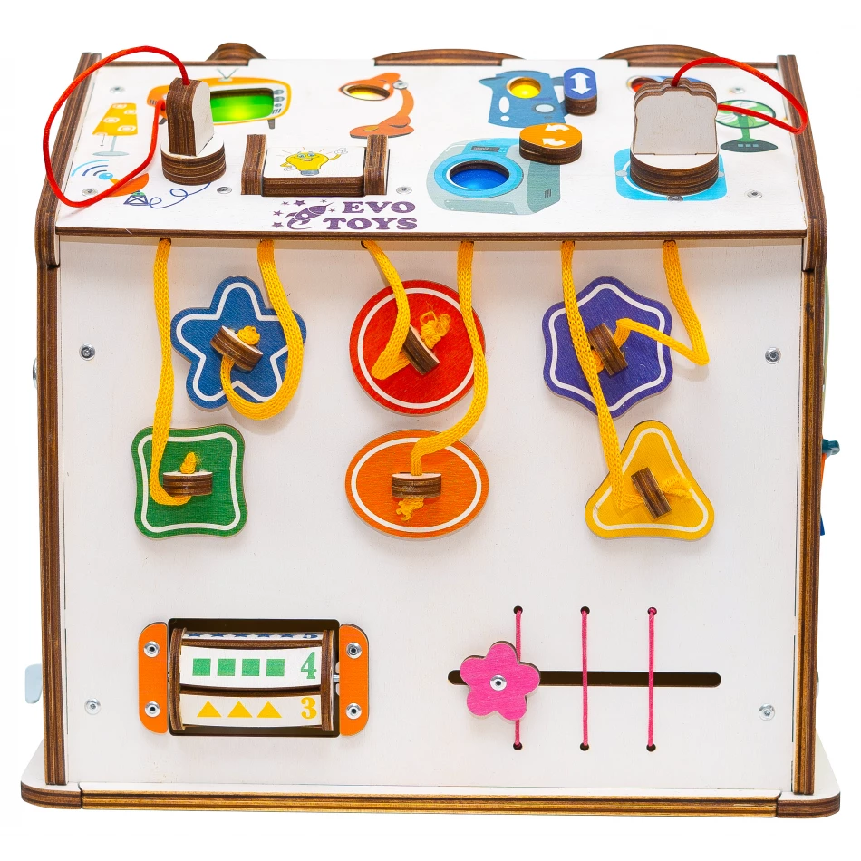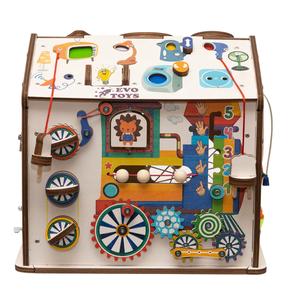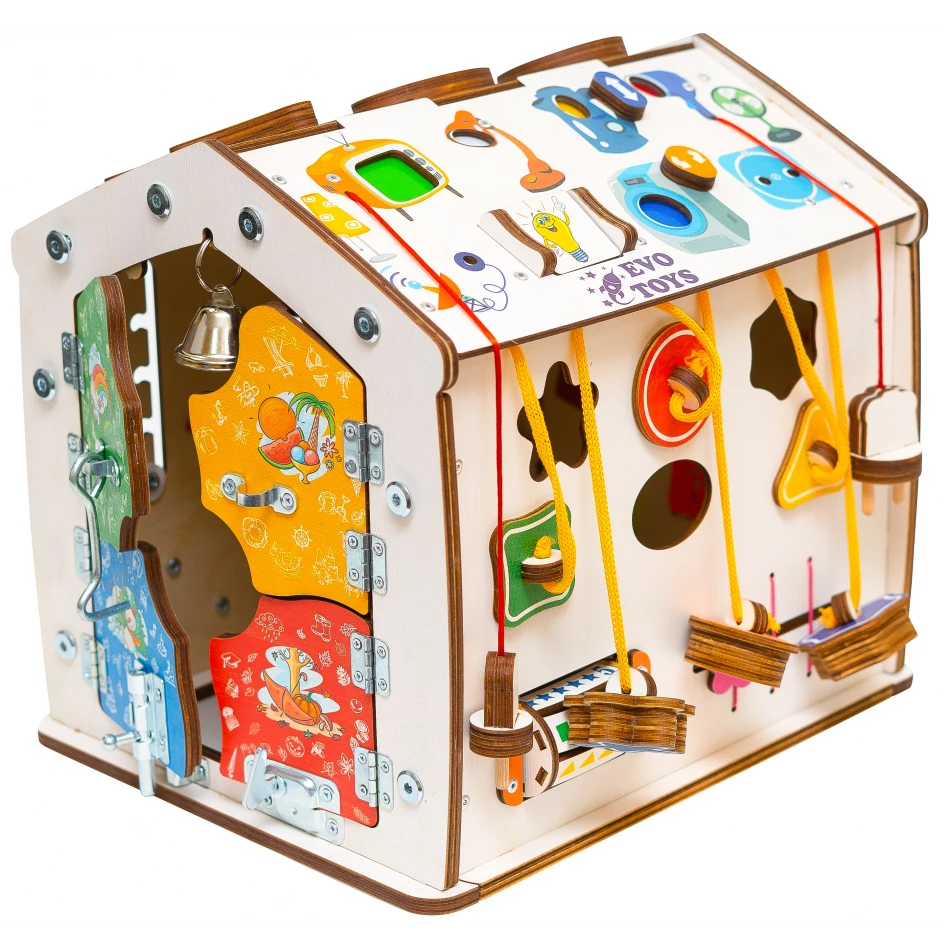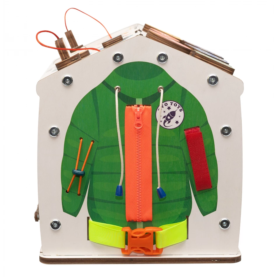 Благодаря продуманному наполнению, бизиборд стимулирует ребенка каждый день узнавать что-то новое: как различать предметы по цвету и форме, застегивать одежду, открывать разные типы замков. А еще на домике есть блок подсветки с выключателем, штепселем и вилкой с розеткой, сделанными из дерева.