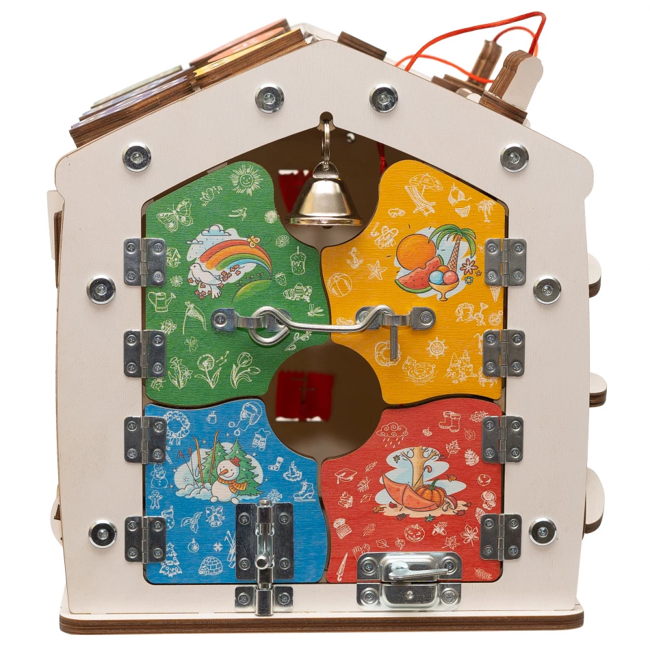 Этот бизиборд отлично подходит и малышам, и деткам 3-4 лет, потому что он оснащен как простыми, так и сложными элементами. Крохам полезно крутить и ощупывать детали, развивая мелкую моторику и координацию движений. А дошкольники учат цвета, геометрические фигуры, названия времен года, цифры.