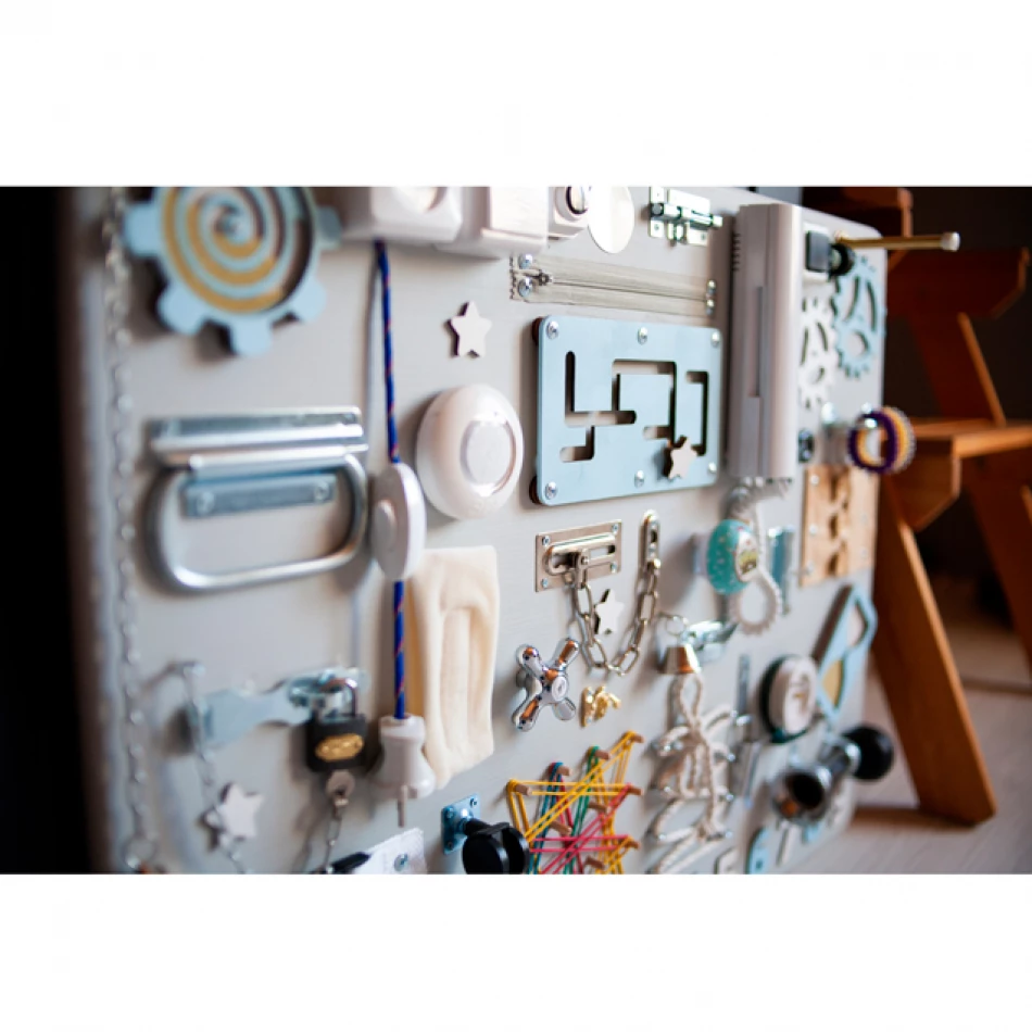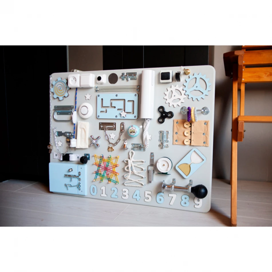Производитель подобрал для наполнения этой бизидоски только те предметы, которые наверняка заинтересуют маленького непоседу. Изучая их, малыш станет более самостоятельным, научится мыслить логически и даже освоит счет от 1 до 12. А лабиринт и геоборд превосходно подготавливают пальчики и кисти рук ребенка к письму.